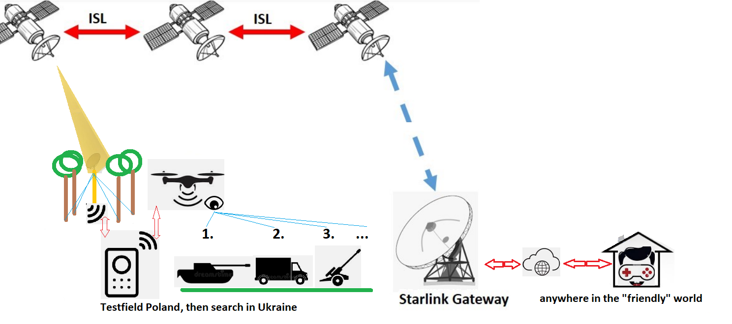 Start a web page, invite all interested parties to participate in a drone precision game in ie Poland. Use interfaces between Elon s Starlink dishes and the drones, tell Elon to create a special drone channel with low latency. Let a user remotely control the drone (ie DJI Mini3) from his home. The more tanks he finds from a certain distance, the more points he/she receives. The best are allowed to use remote-controlled drones above Ukraine battle fields to detect enemy vehicles. The soldiers would only recharge and pose drones, interfaces and dishes. The dish could ie be installed between 4 tree-tops, mounted onto a stackable pole (ie light 2m pcs easily transportable by ATV), and fixed with dia 1mm steel wires to the trunks.